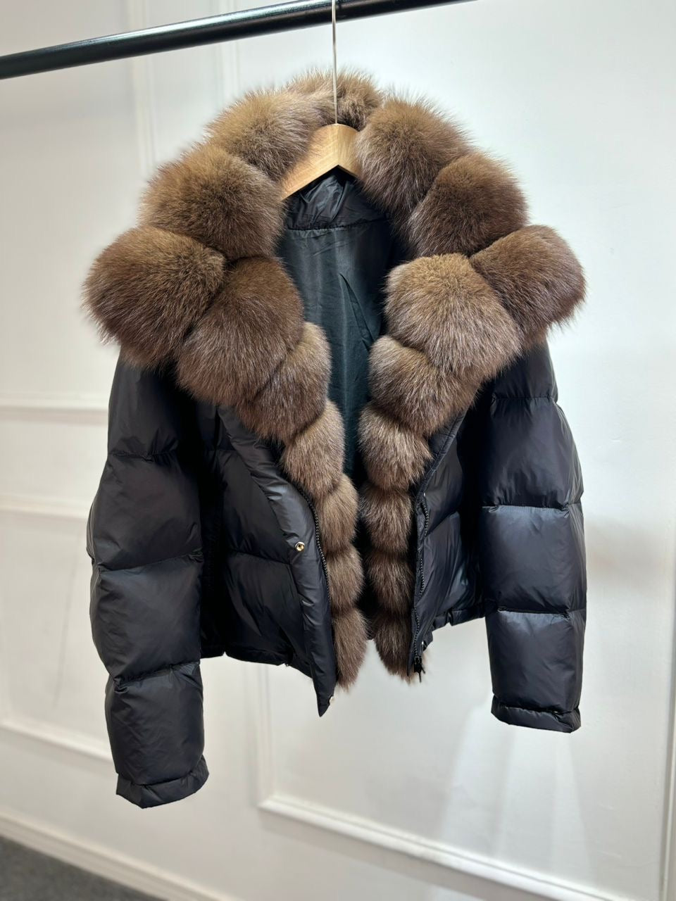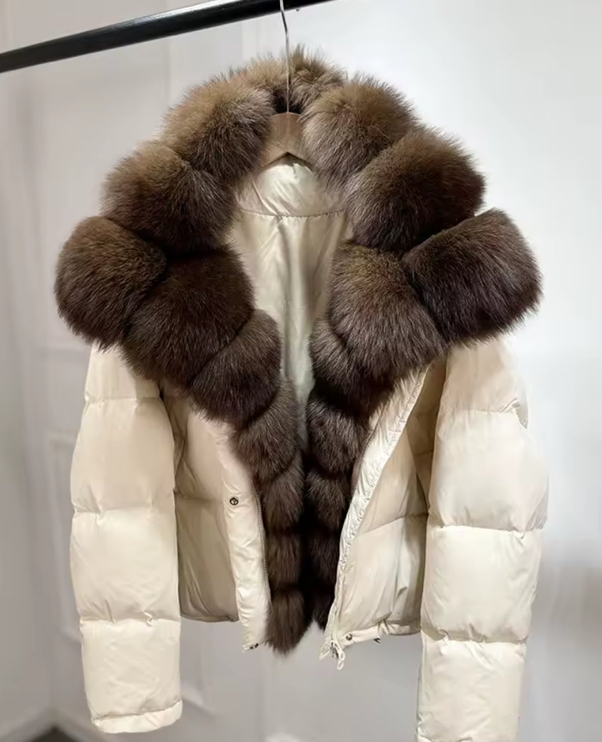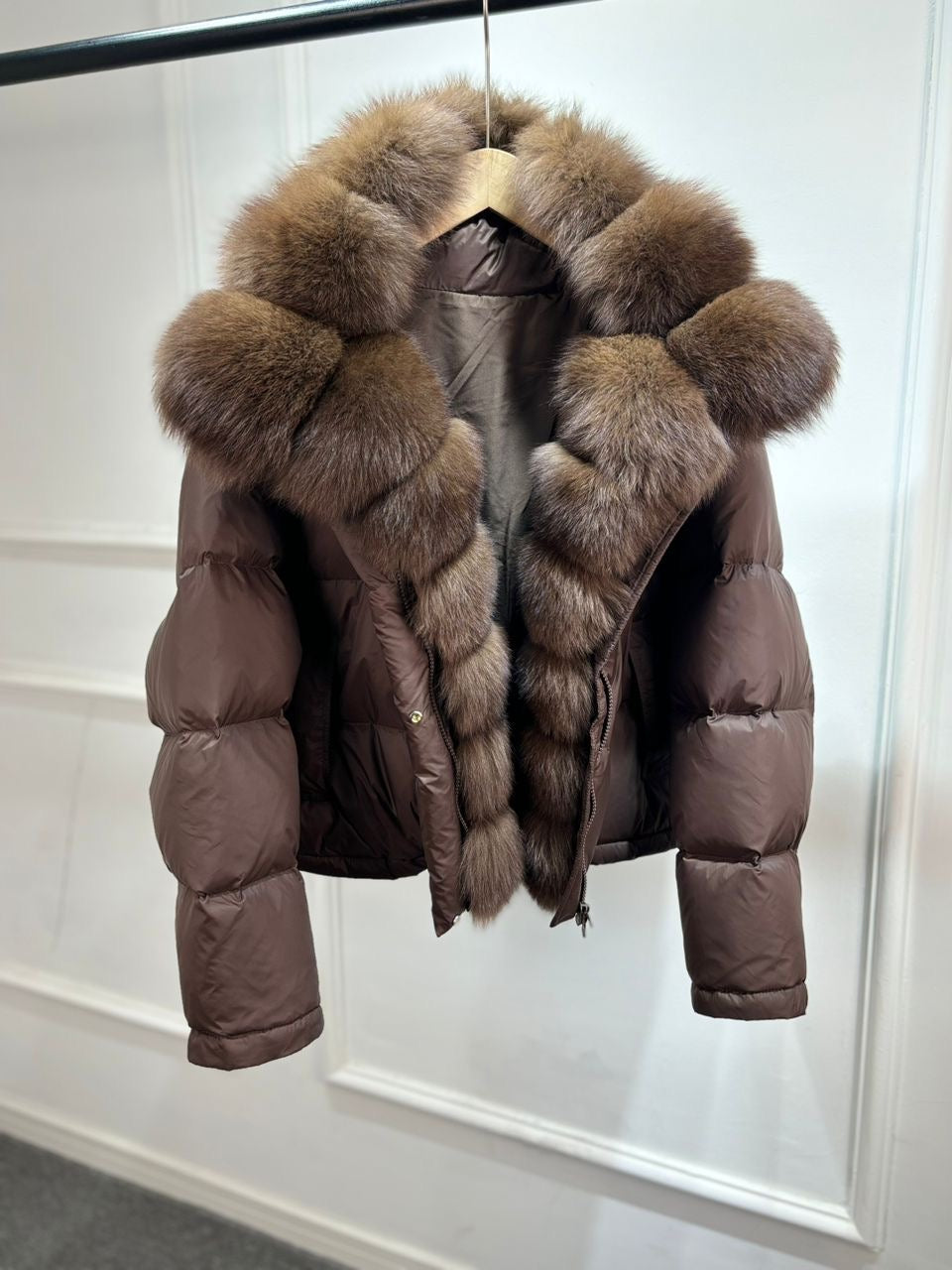 Indulge in warmth and sophistication with this stunning down jacket. Crafted and filled with premium down for superior insulation, it’s the perfect blend of function and luxury. The statement fur collar — plush, full, and irresistibly soft — frames the neckline beautifully, adding an elevated touch to your cold-weather ensemble.