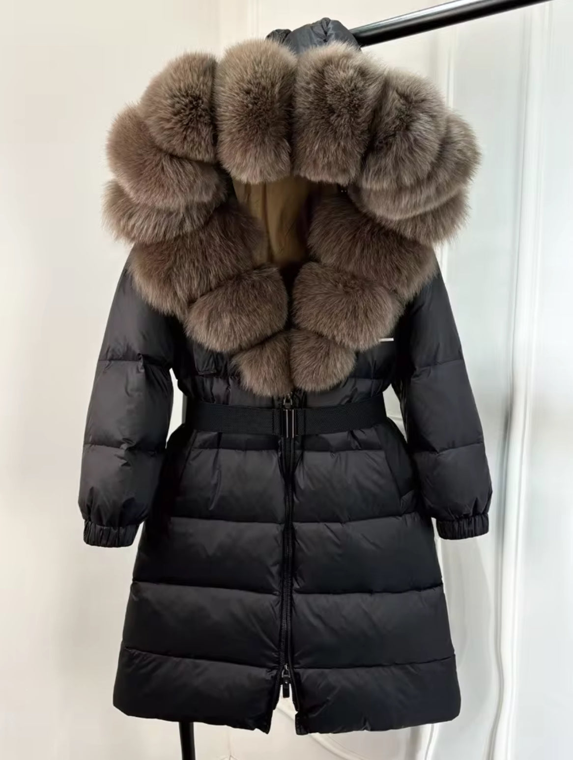 Wrap yourself in elegance and warmth with this Luxury Down Parka, crafted for ultimate winter sophistication. The coat features a premium quilted down shell for superior insulation and a lavish oversized fur trim that adds dramatic flair and unparalleled comfort. Designed with a cinched waist belt, it flatters the silhouette while offering a customizable fit.
