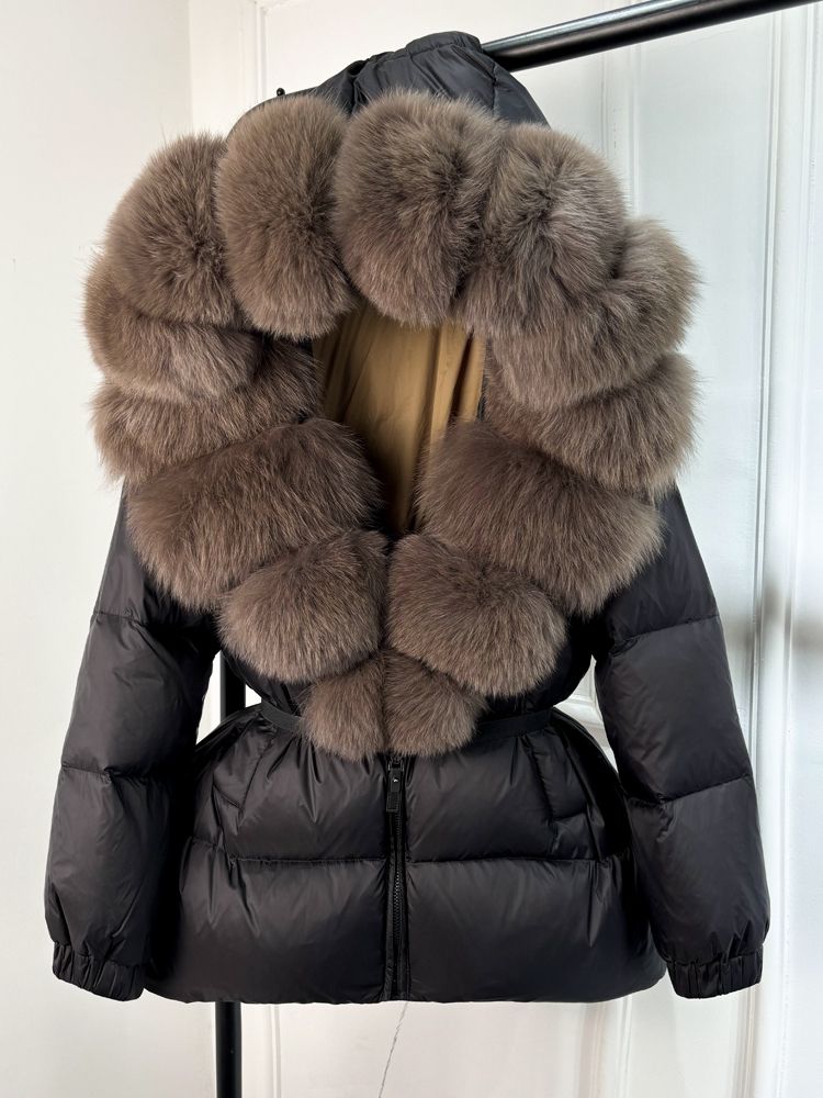 Crafted from a high-density, water-resistant shell, the coat offers exceptional insulation thanks to its premium down filling, keeping you effortlessly warm even on the coldest days. The cinched waistline with an elasticated belt enhances your silhouette while maintaining a sleek, feminine fit.